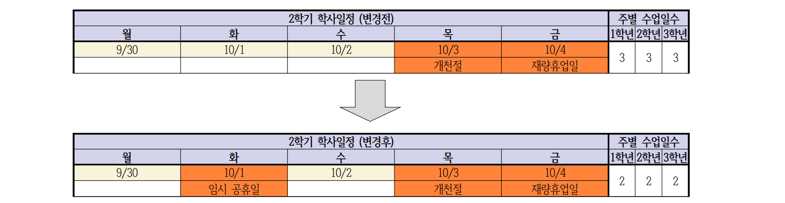 ±¹±ºÀÇ ³¯(10¿ù 1ÀÏ, È­) ÀӽðøÈÞÀÏ ÁöÁ¤À¸·Î ´ÙÀ½°ú °°ÀÌ ÇлçÀÏÁ¤ÀÌ º¯°æµÇ¾î ¾È³»µå¸³´Ï´Ù.